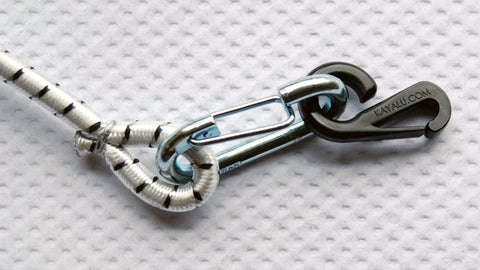 The Kayalite-SUP clips to a leash plug, FCS fin plug, D-Ring, or any existing eyelet on deck. To secure, you simply pull the tension cord taut with a single hand and cinch it on the Kayalite-SUP's built-in jam cleat. In a pinch, the Kayalite-SUP's universal clip can even be fastened to a taut bungee or deck rigging.